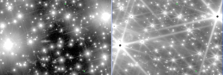 These images shows HST and JWST side by side. In JWST the stars are snowflaked shaped because the mirrors are hexagonal. The JWST is about 5 hours and the HST is about 45 hours (giving an idea of the sensitivity) but the wavelength of the JWST is longer than HST so to do same image …